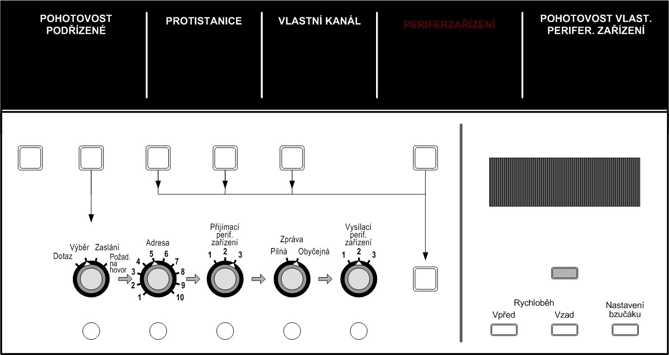K ovládání uvedených hlavních provozních možností sloužily ovládací a indikační prvky na předním panelu KZPD (viz obrázek níže).